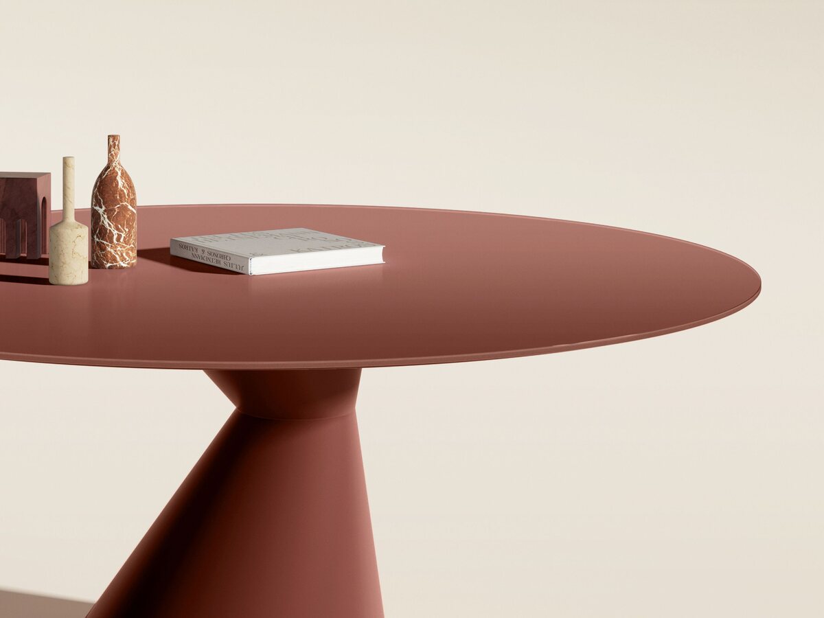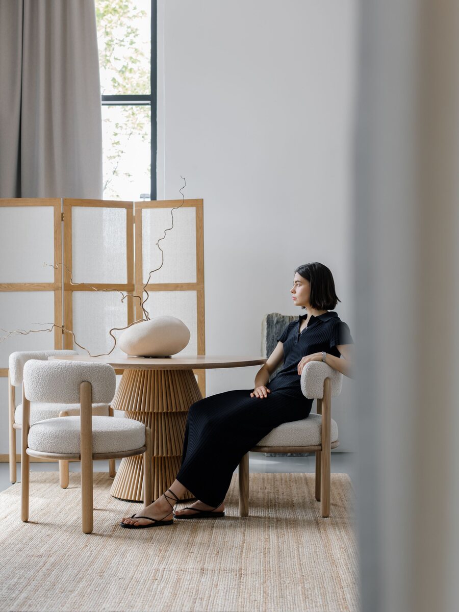 • A sculptural round oak table inspired by traditional Ukrainian architecture.
