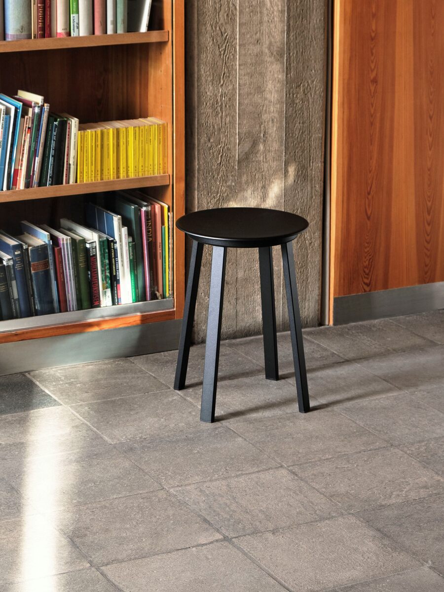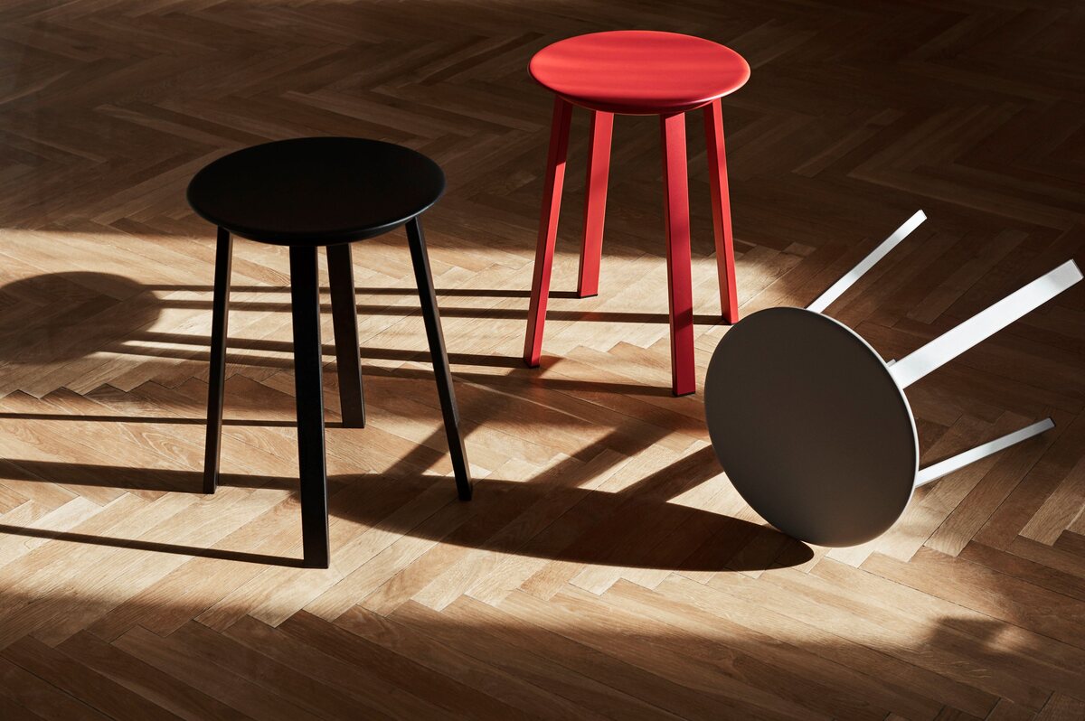 • A minimalist steel bar stool with 360° swivel seat, available in three finishes.