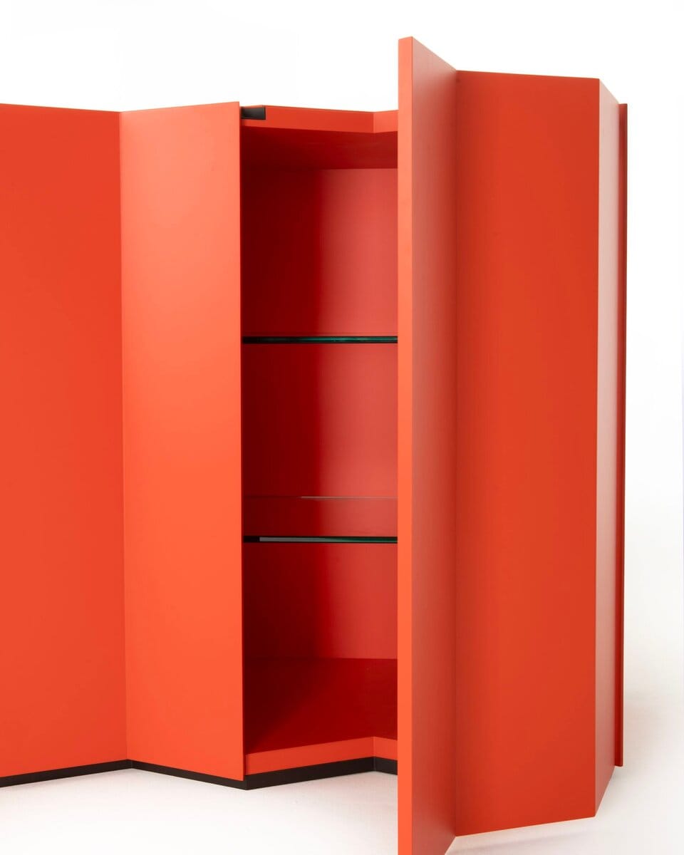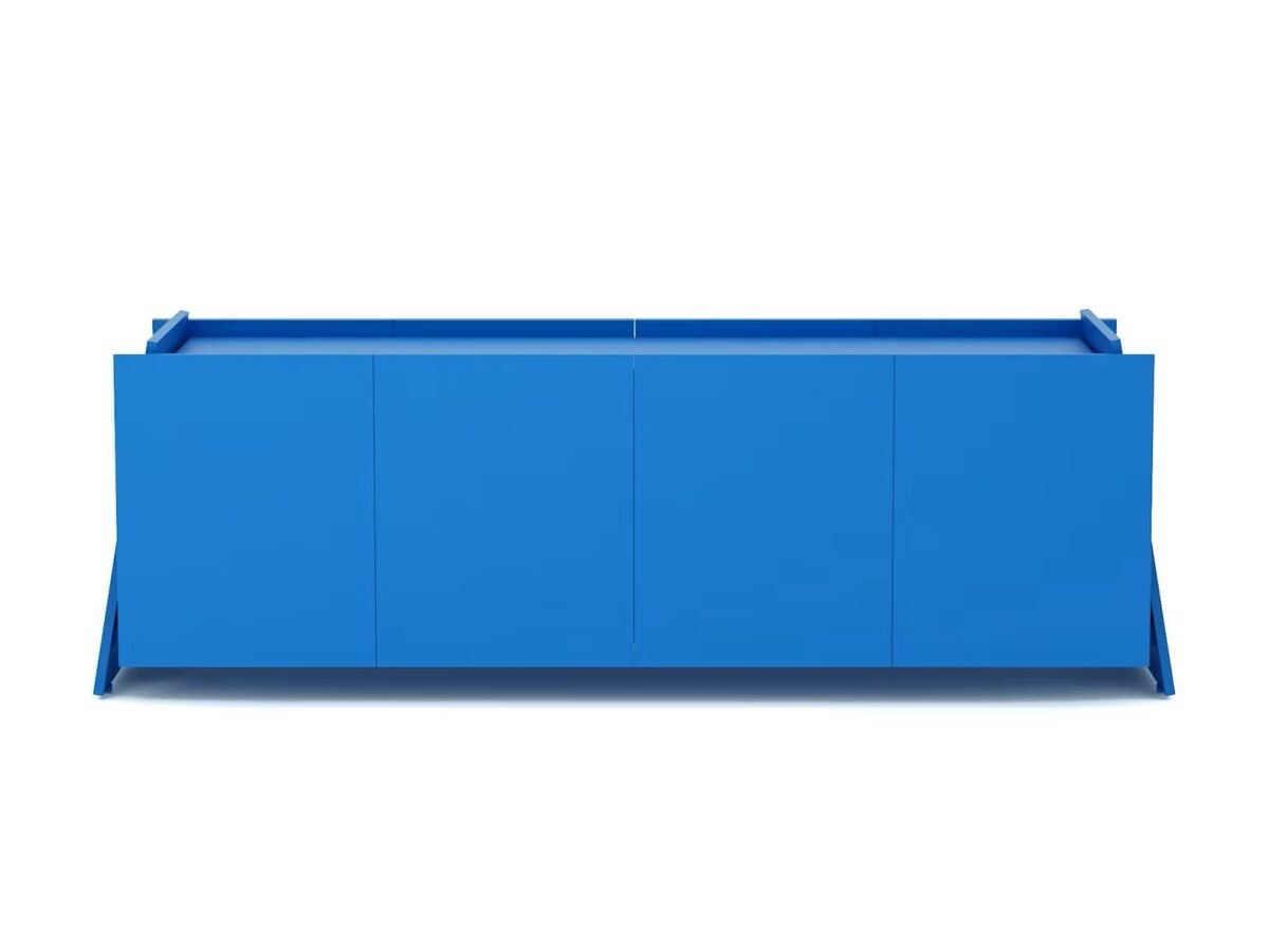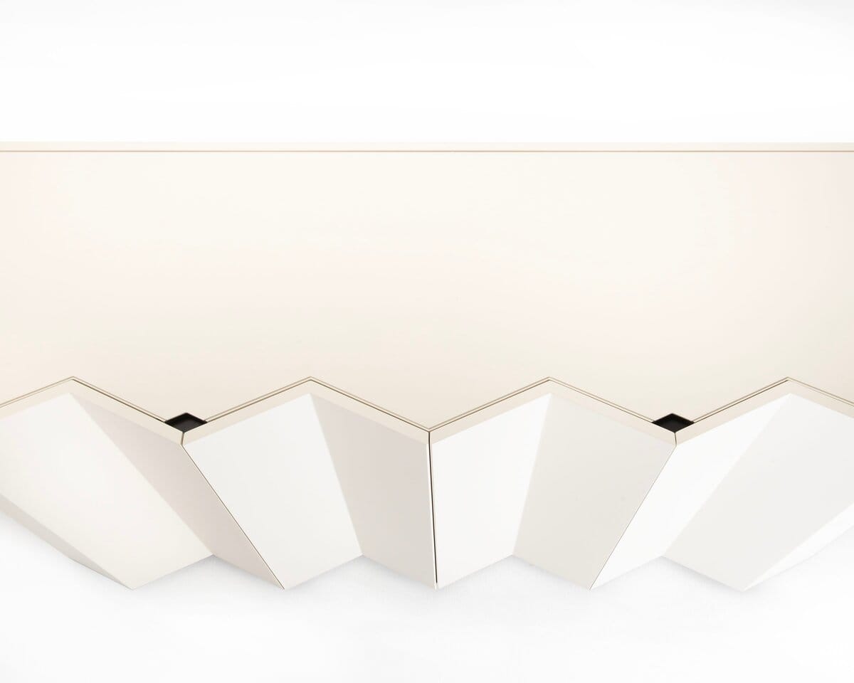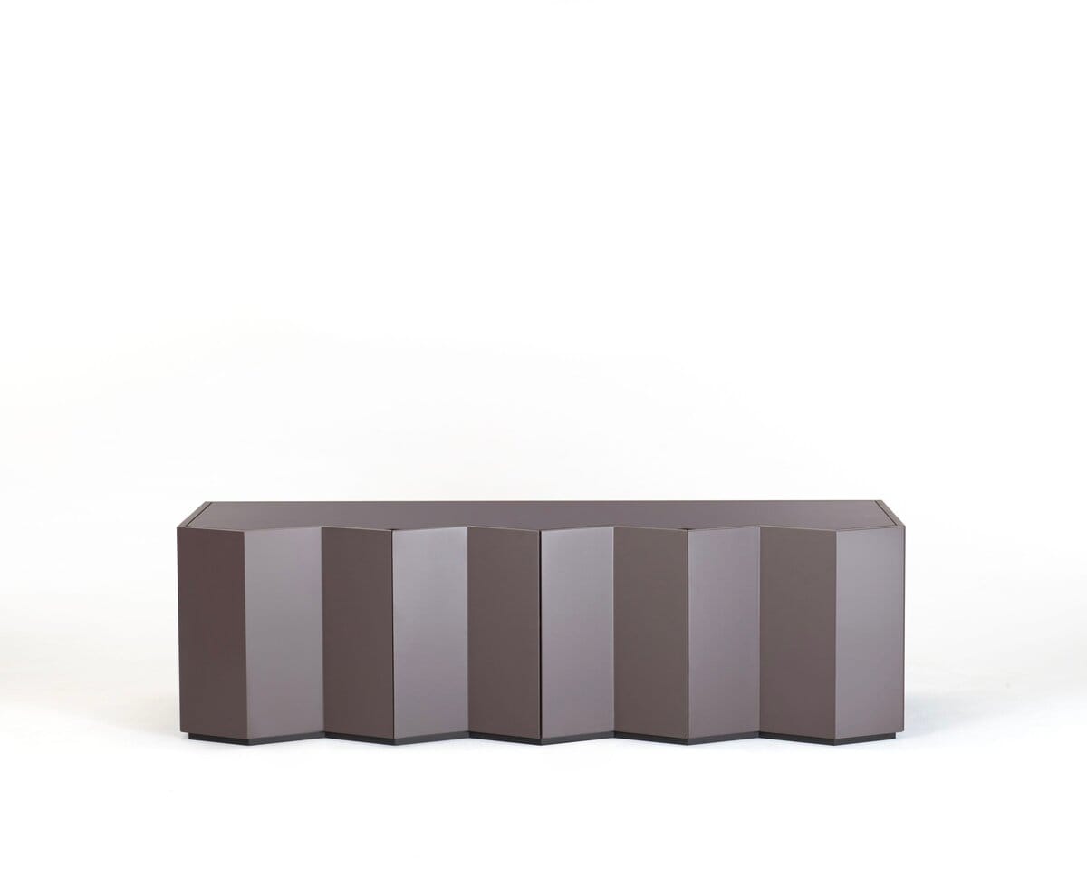 • A contemporary sideboard with a geometric facade and adjustable glass shelves.