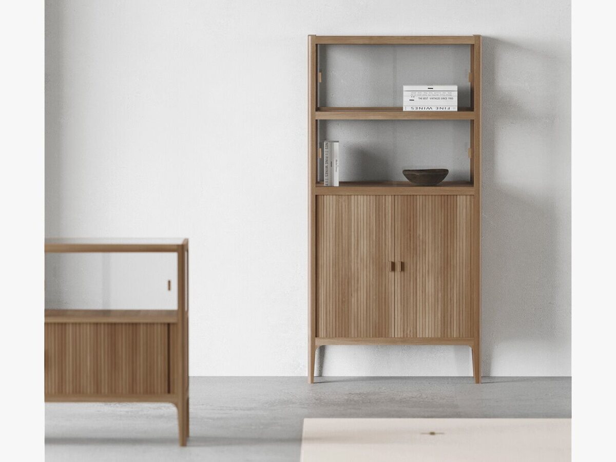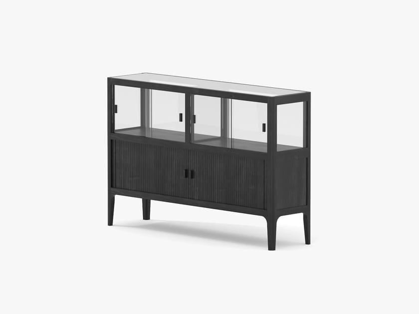 • A minimalist sideboard with matte lacquered MDF structure and oak veneer top.