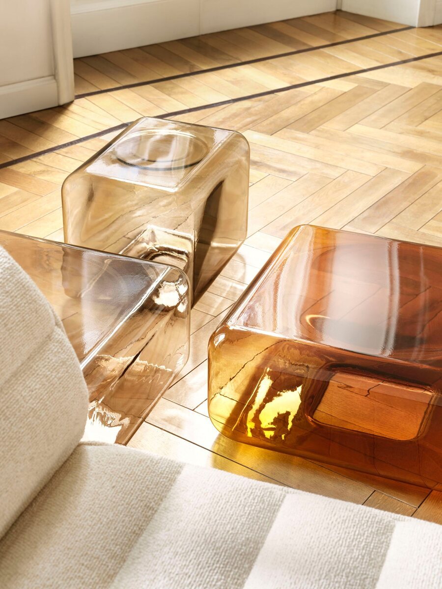 • A sculptural coffee table made of blown glass with a glossy finish.