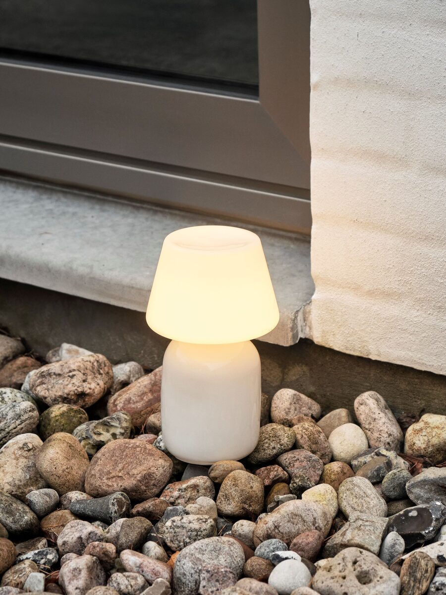 The Apollo Portable Lamp by HAY is a free-standing lamp designed for both indoor and outdoor use. Handmade from a single piece of mouth-blown opal glass, it features a rechargeable battery concealed within the shade, providing up to 10 hours of warm, ambient light. Its minimalist design and portability make it suitable for various settings.