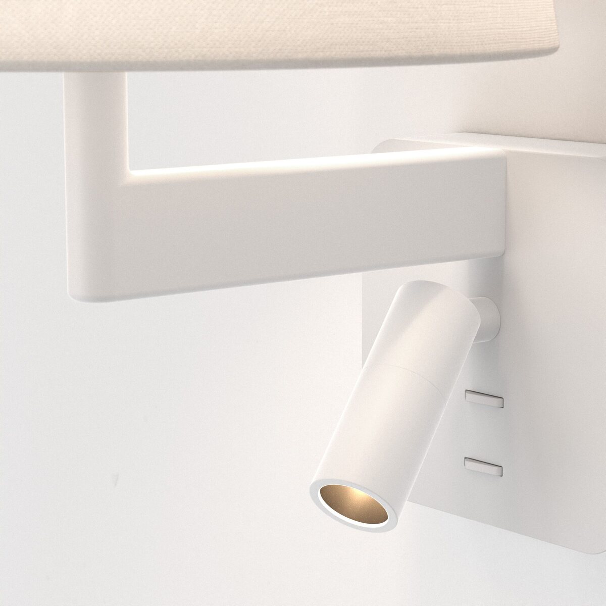 The Beaumont Reader Wall Lamp by Astro Lighting is designed for bedside use, featuring a compact die-cast zinc base with rounded corners. Its directional light and choice of fabric shade finishes make it a perfect reading companion.