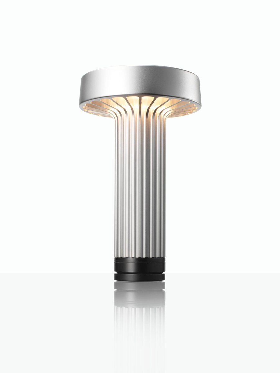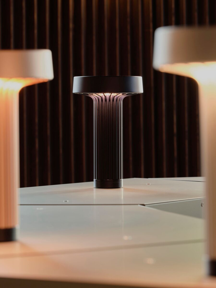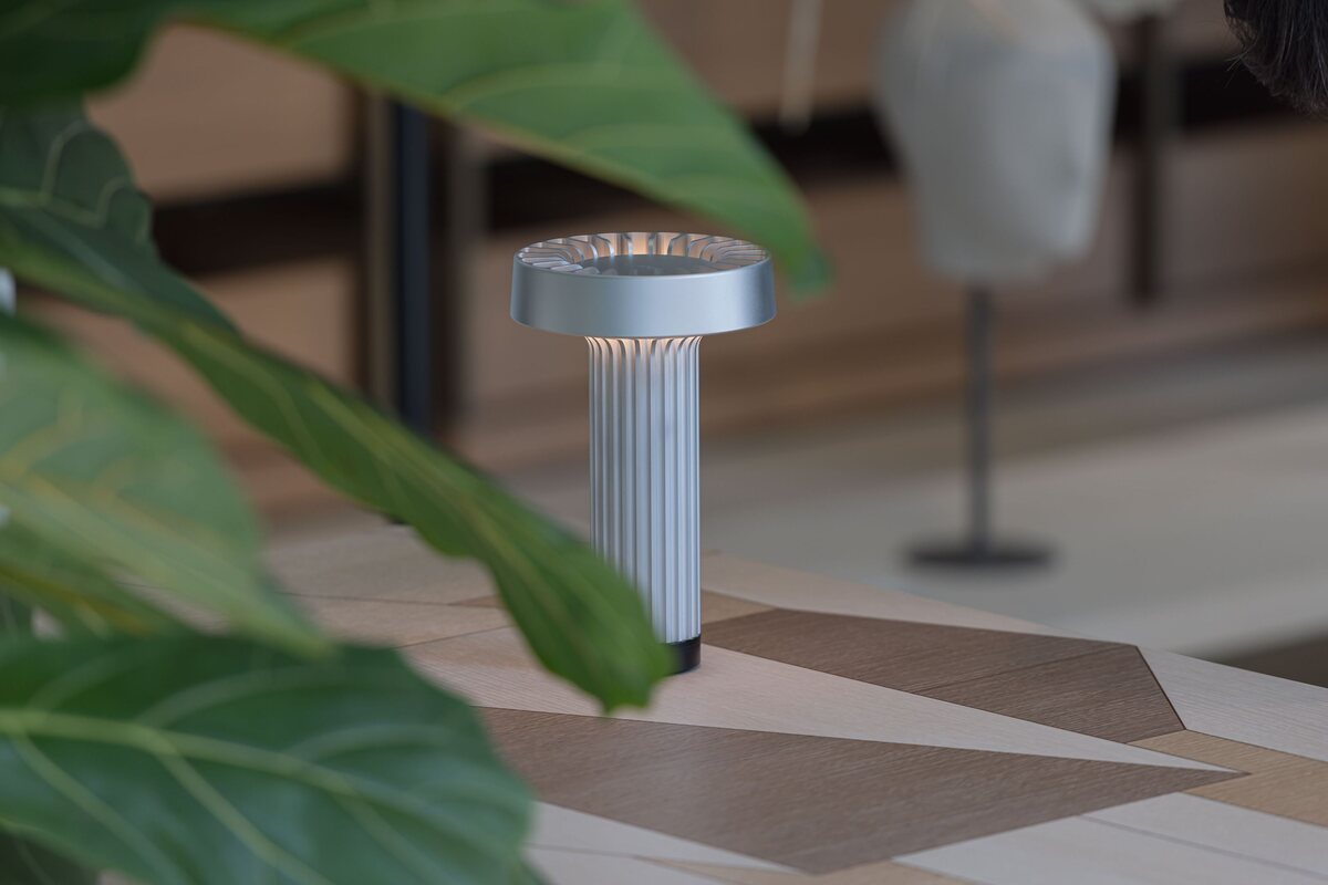 The Fotica Lamp by Ambientec is an LED table lamp designed by Kensaku Oshiro. It features USB charging capabilities and a compact form factor, making it suitable for various settings.