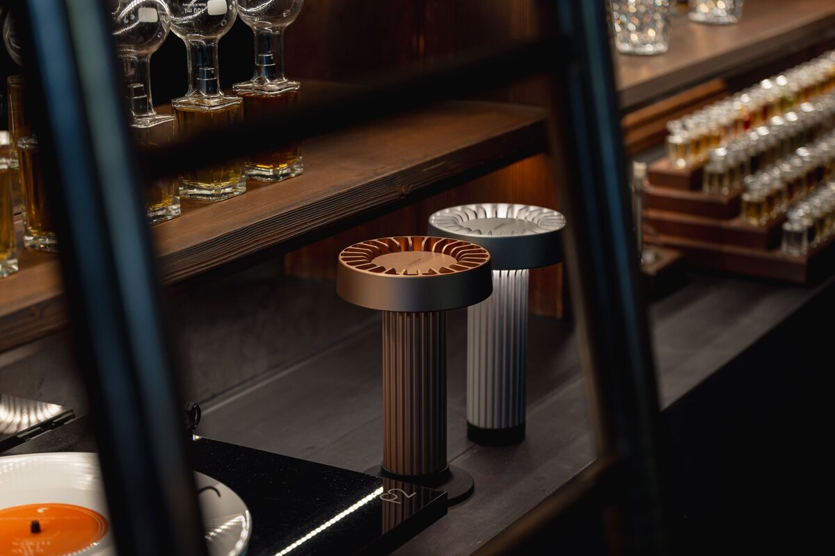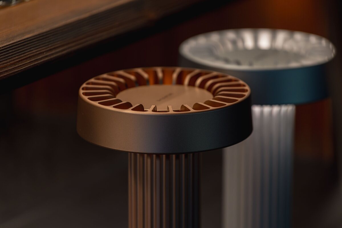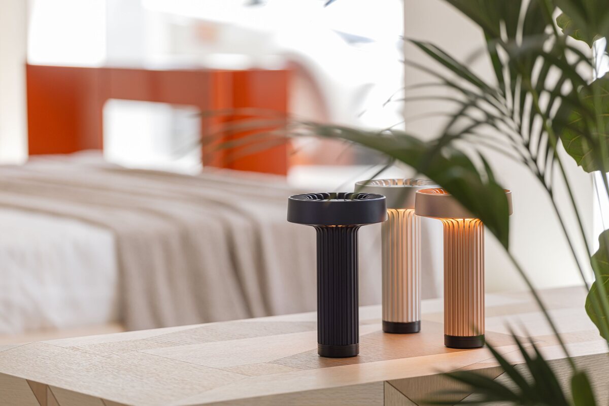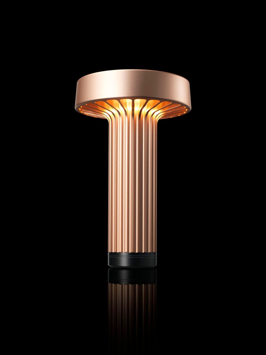 The Fotica Lamp by Ambientec is an LED table lamp designed by Kensaku Oshiro. It features USB charging capabilities and a compact form factor, making it suitable for various settings.