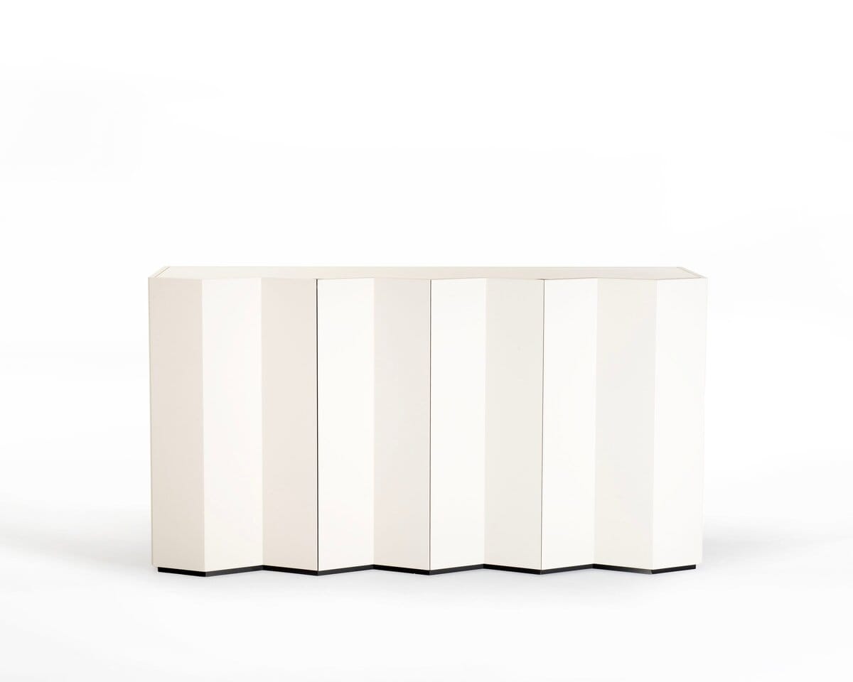 A contemporary sideboard with a geometric facade and adjustable glass shelves.