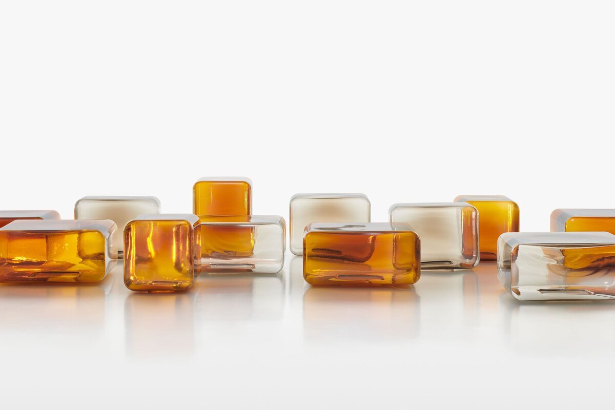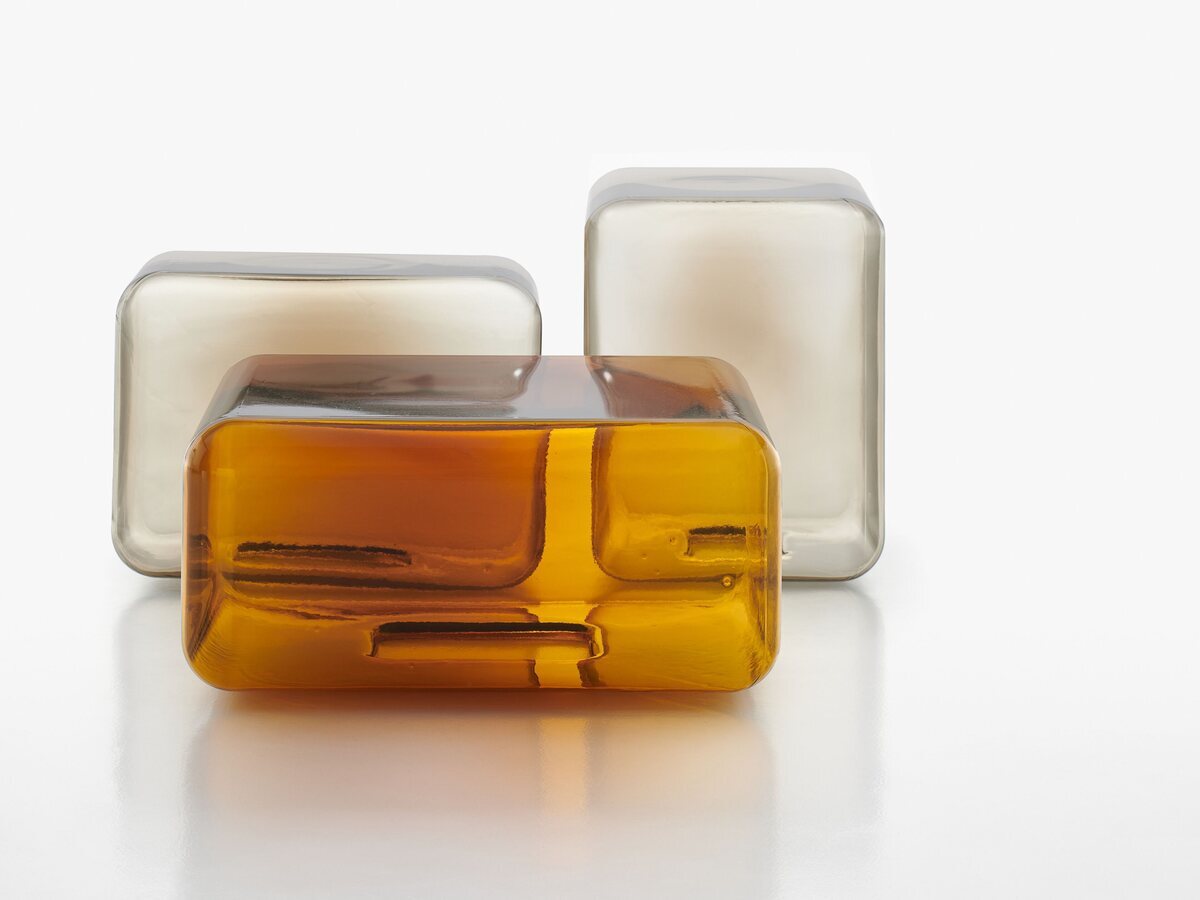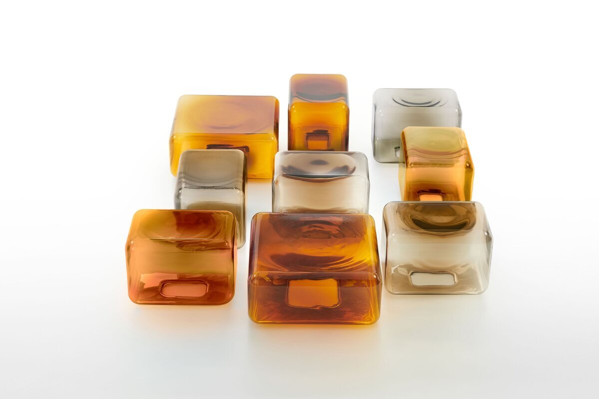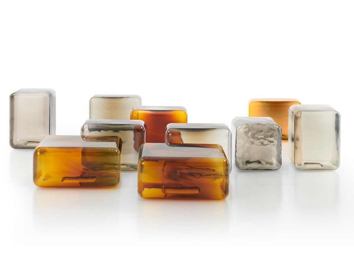 The Glass Coffee Table by Acerbis is crafted from crucible-tinted blown glass, available in amber or smoked grey. Designed by Sabine Marcelis, its minimalist shape and glossy finish create a strong visual impact.