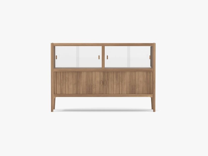 The Glass Display Sideboard by Air Division showcases a solid wood frame with glass panels and sliding doors. Its design features gracefully curved corners and tapered legs, blending contemporary style with timeless elegance.
