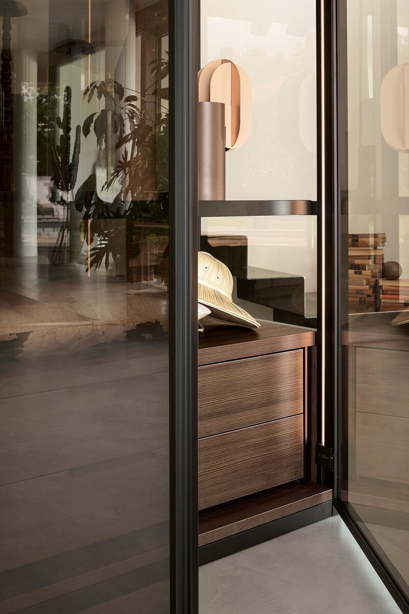 The Glass Wardrobe by Lema features all-glass doors and sides, aluminum structural elements, and built-in lighting options. Offers a refined, transparent look.