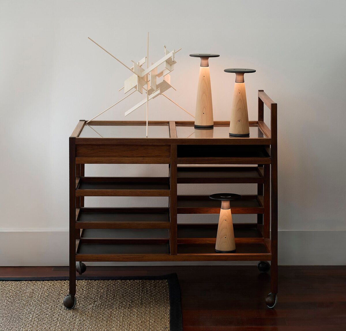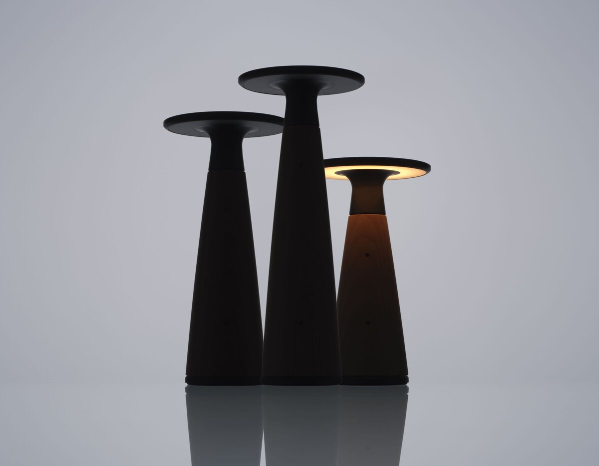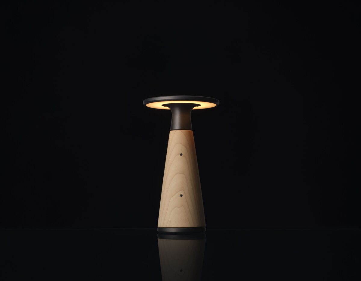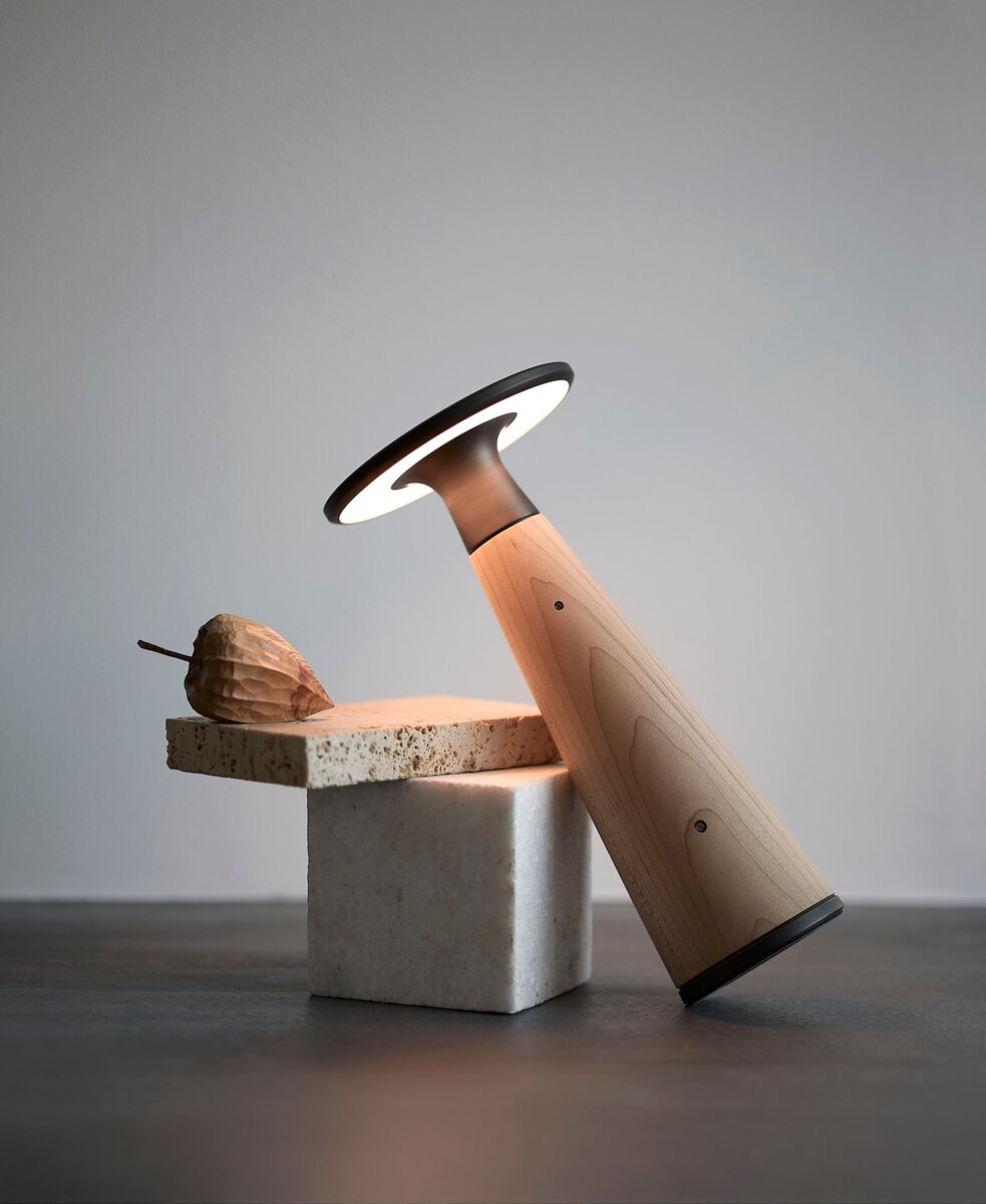 The Vosco Lamp by Ambientec is a rechargeable LED table lamp featuring wooden components. Designed by Nao Tamura, it offers flexibility with its interchangeable parts and provides a warm, ambient light.